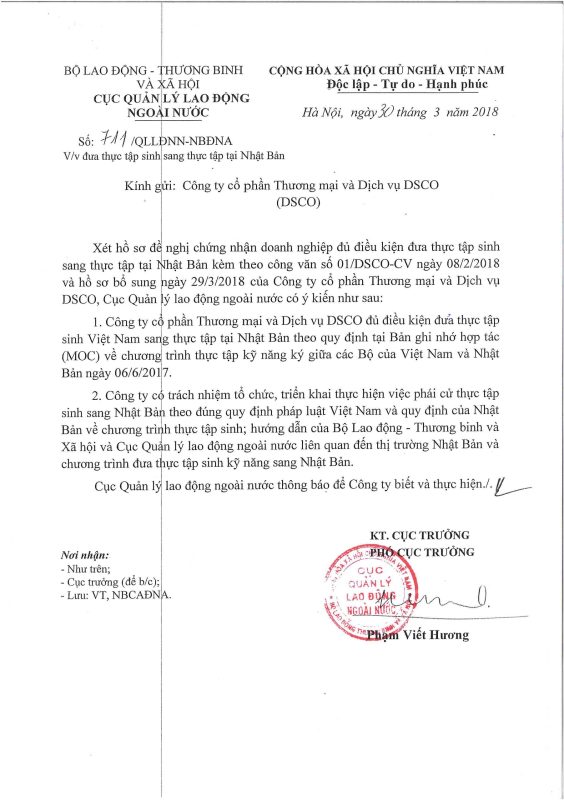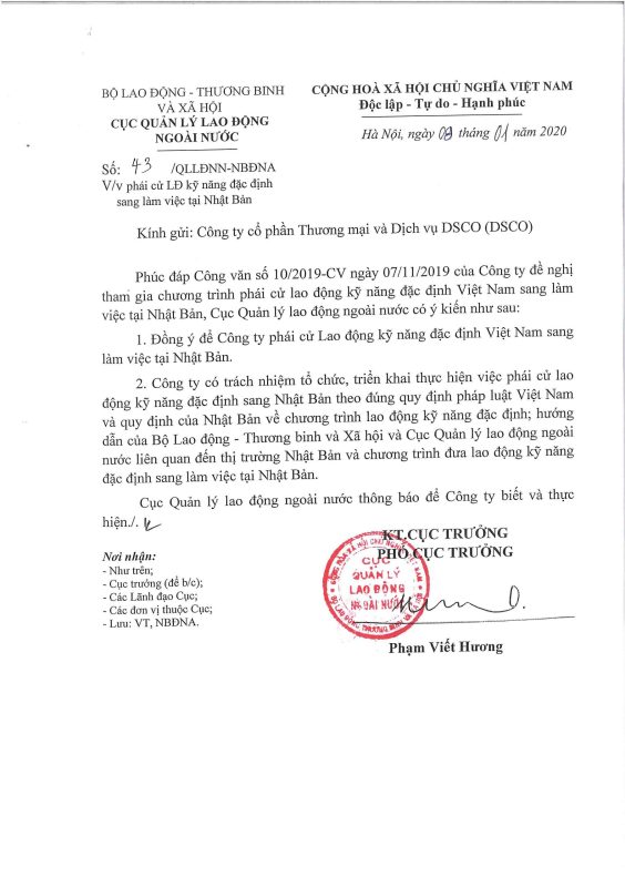 Với thị trường Nhật Bản, Công ty DSCO luôn tiên phong khai thác mở rộng thị trường, đa dạng hoá ngành nghề. Không ngừng kết nối với các đối tác Nhật tạo nên mạng lưới thông tin tuyển dụng lao động chất lượng cao kịp thời đáp ứng yêu cầu nguồn lực cho các nghiệp đoàn lớn. Đến nay một lượng lớn người lao động đã được Công ty đưa đi làm việc ở Nhật Bản, có công việc và thu nhập ổn định, làm giàu cho gia đình và quê hương.