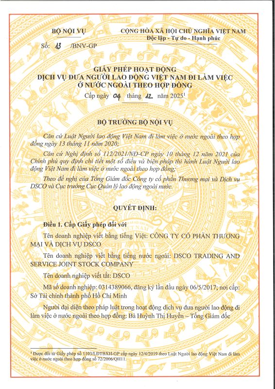 Hoạt động dịch vụ đưa người lao động đi làm việc ở nước ngoài theo hợp đồng đã được Bộ Lao động -Thương binh và Xã hội (cũ) cấp giấy phép nay là Bộ Nội Vụ.