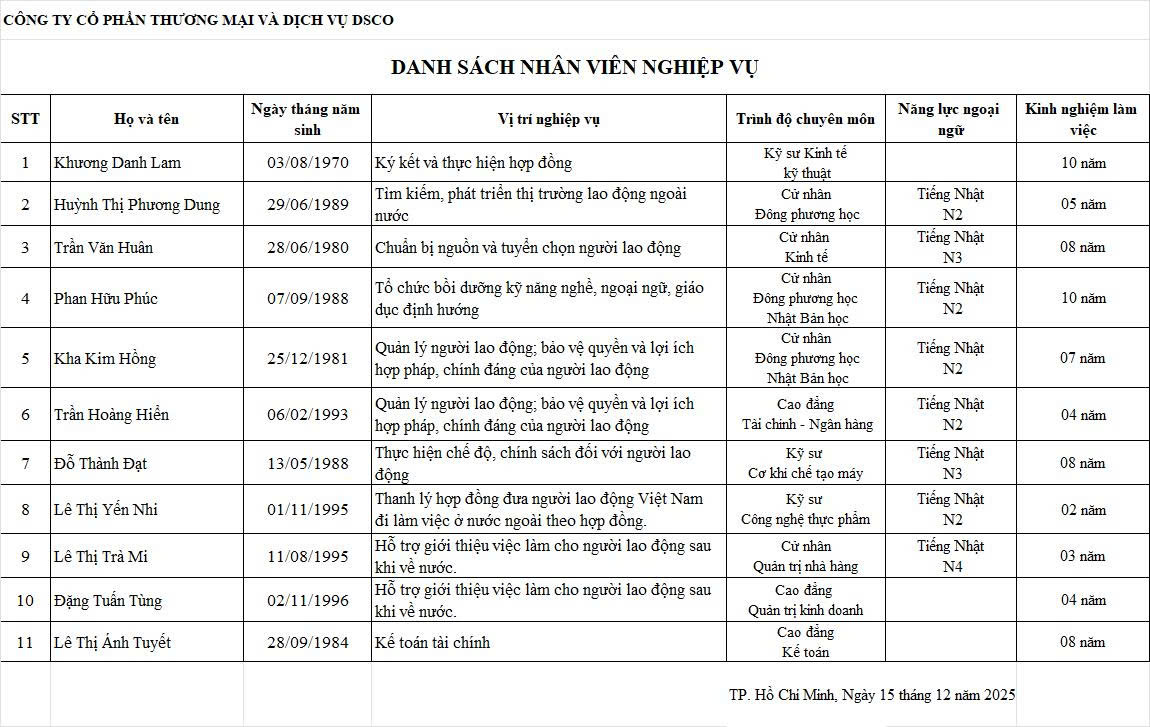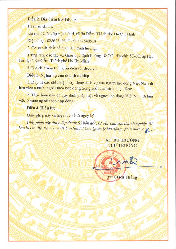 Song song với các dịch vụ chuyên nghiệp và bài bản, Công ty DSCO có nhiều cơ chế hỗ trợ người lao động trong quá trình đào tạo học nghề, đào tạo ngoại ngữ và giáo dục định hướng, với mức phí dịch vụ thấp nhất theo quy định của Bộ Lao động -Thương binh và Xã hội (nay là Bộ Nội Vụ). Người lao động được quản lý, quan tâm và tạo điều kiện tốt nhất từ quá trình tuyển dụng cho đến khi làm việc ở nước ngoài.